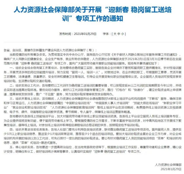 為貫徹落實中共中央辦公廳、國務院辦公廳印發《關于做好人民群眾就地過年服務保障工作的通知》,確保廣大人民群眾的健康安全、企業生產有序、就業形勢總體穩定,人力資源和社會保障部發出《關于開展“迎新春穩崗留工送培訓”專項工作的通知》(以下簡稱“《通知》”),決定于2021年2月1日至3月31日春節前后,在全國范圍內開展“迎新春 穩崗留工送培訓”專項工作,面向廣大留崗勞動者開展職業技能培訓服務。
